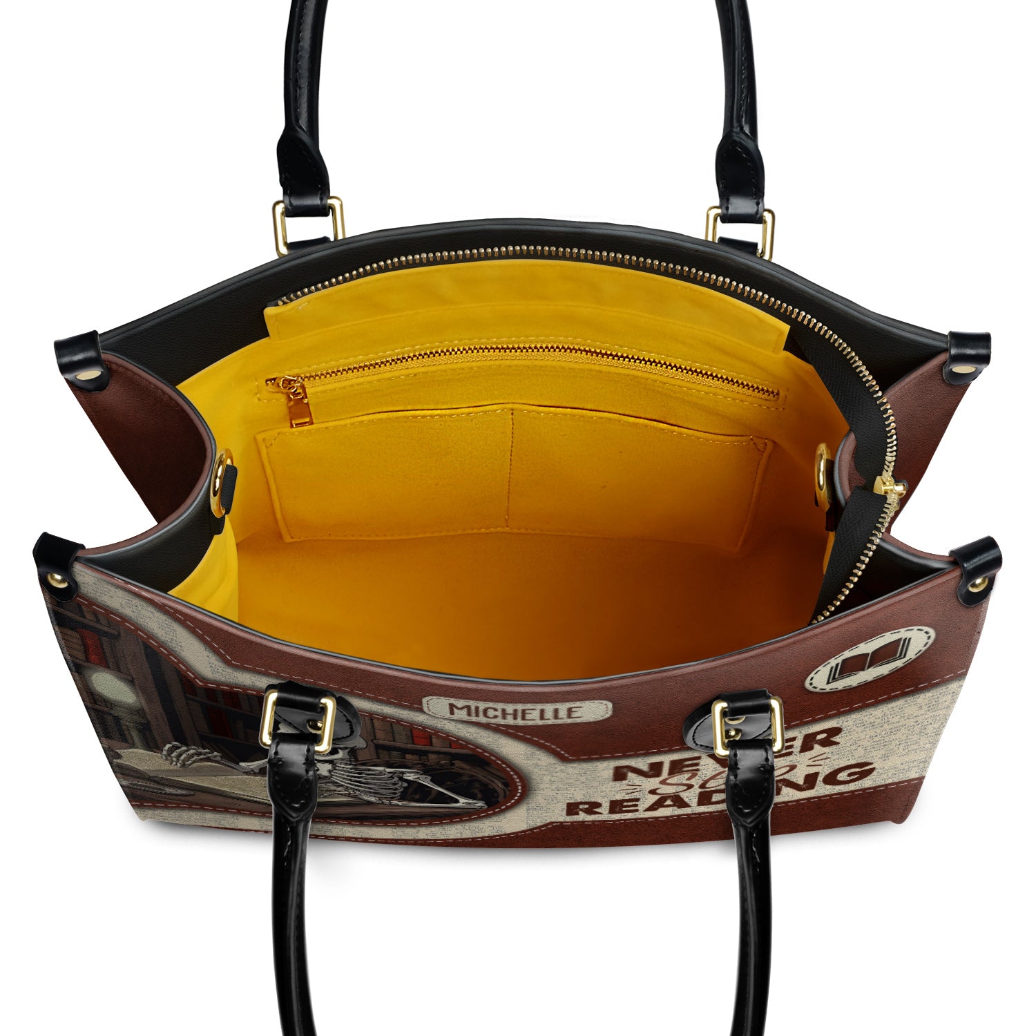 Our custom leather handbags feature a full zip closure that not only keeps your belongings safe and sound but also adds a touch of bookish style.